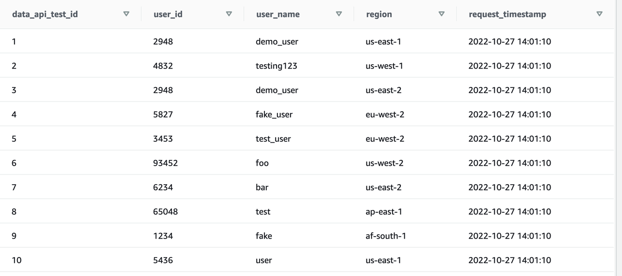 {'ColumnMetadata': [{'isCaseSensitive': False, 'isCurrency': False, 'isSigned': True, 'label': 'data_api_test_id', 'length': 0, 'name': 'data_api_test_id', 'nullable': 0, 'precision': 10, 'scale': 0, 'schemaName': 'demo', 'tableName': 'data_api_test', 'typeName': 'int4'}, {'isCaseSensitive': False, 'isCurrency': False, 'isSigned': True, 'label': 'user_id', 'length': 0, 'name': 'user_id', 'nullable': 0, 'precision': 10, 'scale': 0, 'schemaName': 'demo', 'tableName': 'data_api_test', 'typeName': 'int4'}, {'isCaseSensitive': True, 'isCurrency': False, 'isSigned': False, 'label': 'user_name', 'length': 0, 'name': 'user_name', 'nullable': 1, 'precision': 64, 'scale': 0, 'schemaName': 'demo', 'tableName': 'data_api_test', 'typeName': 'varchar'}, {'isCaseSensitive': True, 'isCurrency': False, 'isSigned': False, 'label': 'region', 'length': 0, 'name': 'region', 'nullable': 1, 'precision': 32, 'scale': 0, 'schemaName': 'demo', 'tableName': 'data_api_test', 'typeName': 'varchar'}, {'isCaseSensitive': False, 'isCurrency': False, 'isSigned': False, 'label': 'request_timestamp', 'length': 0, 'name': 'request_timestamp', 'nullable': 1, 'precision': 29, 'scale': 6, 'schemaName': 'demo', 'tableName': 'data_api_test', 'typeName': 'timestamp'}], 'Records': [[{'longValue': 1}, {'longValue': 2948}, {'stringValue': 'demo_user'}, {'stringValue': 'us-east-1'}, {'stringValue': '2022-10-27 14:01:10'}], [{'longValue': 2}, {'longValue': 4832}, {'stringValue': 'testing123'}, {'stringValue': 'us-west-1'}, {'stringValue': '2022-10-27 14:01:10'}], [{'longValue': 3}, {'longValue': 2948}, {'stringValue': 'demo_user'}, {'stringValue': 'us-east-2'}, {'stringValue': '2022-10-27 14:01:10'}], [{'longValue': 4}, {'longValue': 5827}, {'stringValue': 'fake_user'}, {'stringValue': 'eu-west-2'}, {'stringValue': '2022-10-27 14:01:10'}], [{'longValue': 5}, {'longValue': 3453}, {'stringValue': 'test_user'}, {'stringValue': 'eu-west-2'}, {'stringValue': '2022-10-27 14:01:10'}], [{'longValue': 6}, {'longValue': 93452}, {'stringValue': 'foo'}, {'stringValue': 'us-west-2'}, {'stringValue': '2022-10-27 14:01:10'}], [{'longValue': 7}, {'longValue': 6234}, {'stringValue': 'bar'}, {'stringValue': 'us-east-2'}, {'stringValue': '2022-10-27 14:01:10'}], [{'longValue': 8}, {'longValue': 65048}, {'stringValue': 'test'}, {'stringValue': 'ap-east-1'}, {'stringValue': '2022-10-27 14:01:10'}], [{'longValue': 9}, {'longValue': 1234}, {'stringValue': 'fake'}, {'stringValue': 'af-south-1'}, {'stringValue': '2022-10-27 14:01:10'}], [{'longValue': 10}, {'longValue': 5436}, {'stringValue': 'user'}, {'stringValue': 'us-east-1'}, {'stringValue': '2022-10-27 14:01:10'}]], 'TotalNumRows': 10, 'ResponseMetadata': {'RequestId': '4ba7938f-1b4f-4ebb-a1c1-000b92fe7e28', 'HTTPStatusCode': 200, 'HTTPHeaders': {'x-amzn-requestid': '4ba7938f-1b4f-4ebb-a1c1-000b92fe7e28', 'content-type': 'application/x-amz-json-1.1', 'content-length': '2445', 'date': 'Thu, 27 Oct 2022 21:38:56 GMT'}, 'RetryAttempts': 0}}